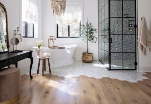 When choosing your floors, keep in mind the “Rule of 3” for flooring. This is a design idea that you want to have a max of 3 different floor styles throughout your home, so that you have a cohesive and balanced look. Try to have the same flooring throughout several rooms.